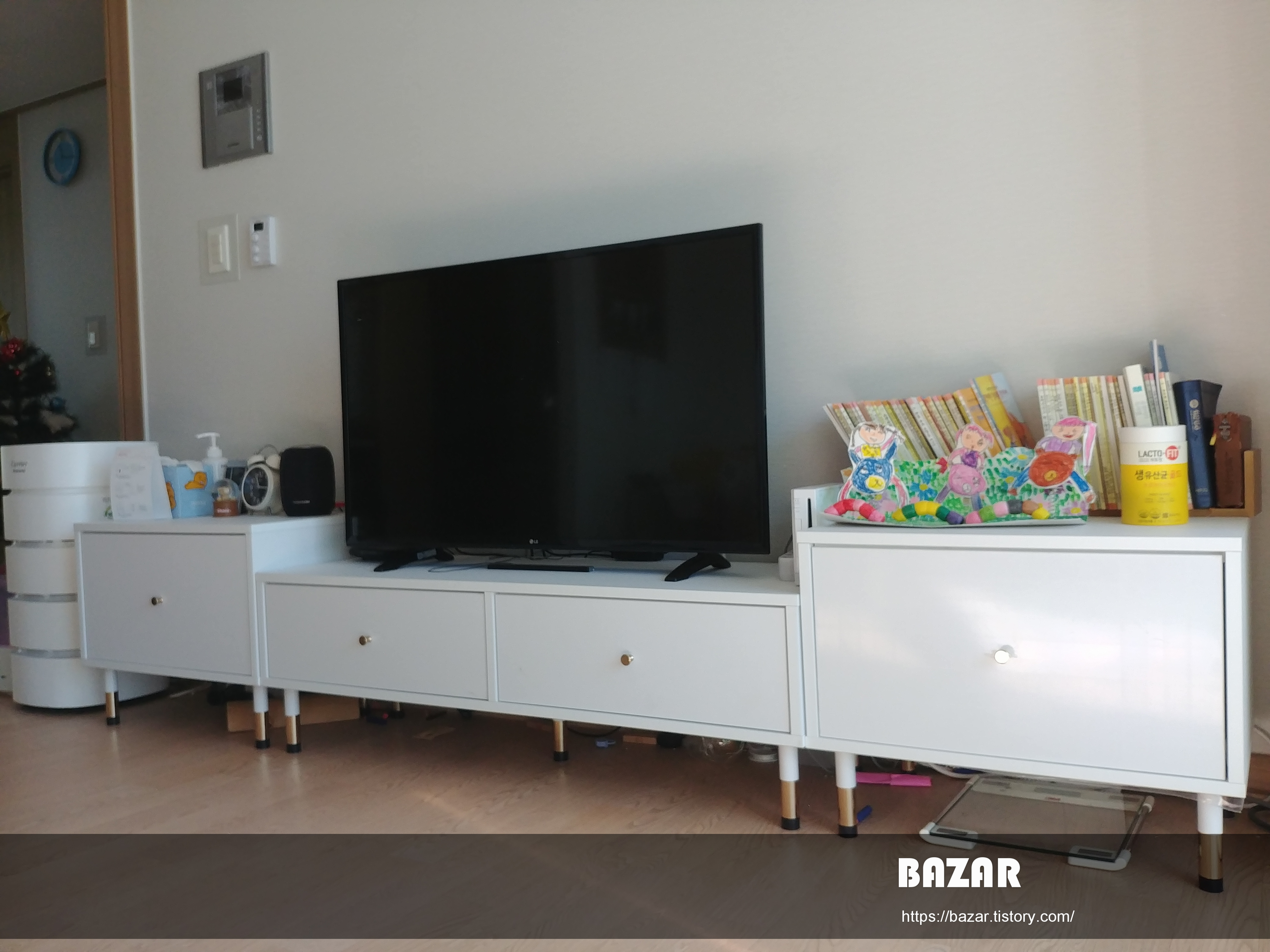 아무튼 처음에는 위에 KT 지니와 공유기 이외에는 아무것도 없었는데 5개월 정도 사용하다 보니 Wii도 올라오고, 시계도 책들도 잡다한 물건들이 하나 둘 올라오기 시작했습니다. 거실장 아래에도 물건들이 몰래 숨어 가네요. 하지만 어느 정도 높이가 있어 청소하기에도 편하고 물건이 들어가도 꺼내기 좋습니다.