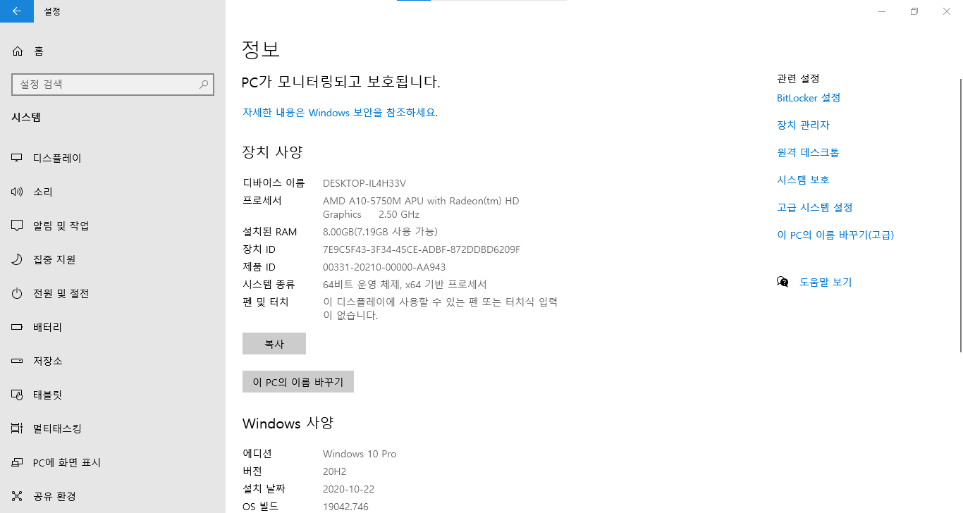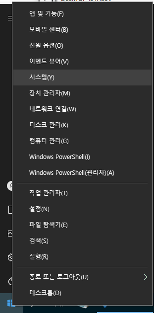 때로는 자신의 CPU 및 RAM 용량을 확인해야 할 때가 있습니다. 그런 경우에는 원도우 10의 시작 버튼에 마우스를 올려놓고 마우스 오른쪽 버튼을 클릭하면 시스템으로 접근할 수 있습니다.
