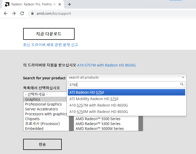 수동으로 드라이브를 찾는 방법은 아래와 같이 모델명을 직접 타이핑하는 겁니다. 저의 경우 아주 오래된 노트북 이다 보니 "A10-5750M with Radeon HD 8650G" 찾아 이동합니다.