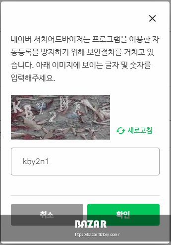 그럼 앞에서도 말했듯이 자동등록 방지 창이 뜹니다. 창에 보이는 영문과 숫자를 입력해 주시면 됩니다. 이때 영어를 꼭 대문자로 입력하지 않으셔도 됩니다. 소문자로 입력해도 아무런 문제가 없답니다.