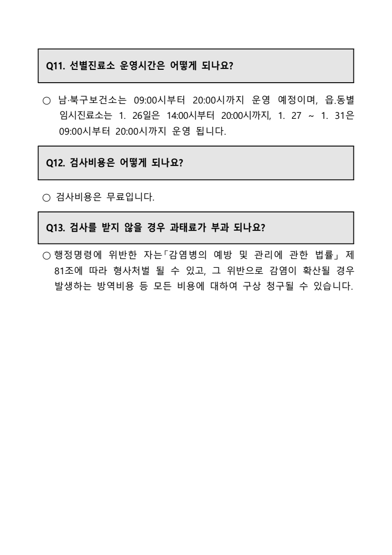 ※ 1월 28일 오후부터 한파가 예상됨에 따라 선별진료소 운영시간을 오후 6시까지로 당기게 되고, 29일에는 오후 2∼6시에만 운영합니다. 축소 운영으로 인해 기간은 하루 더 연장되어 2월 4일까지 받으시면 됩니다.