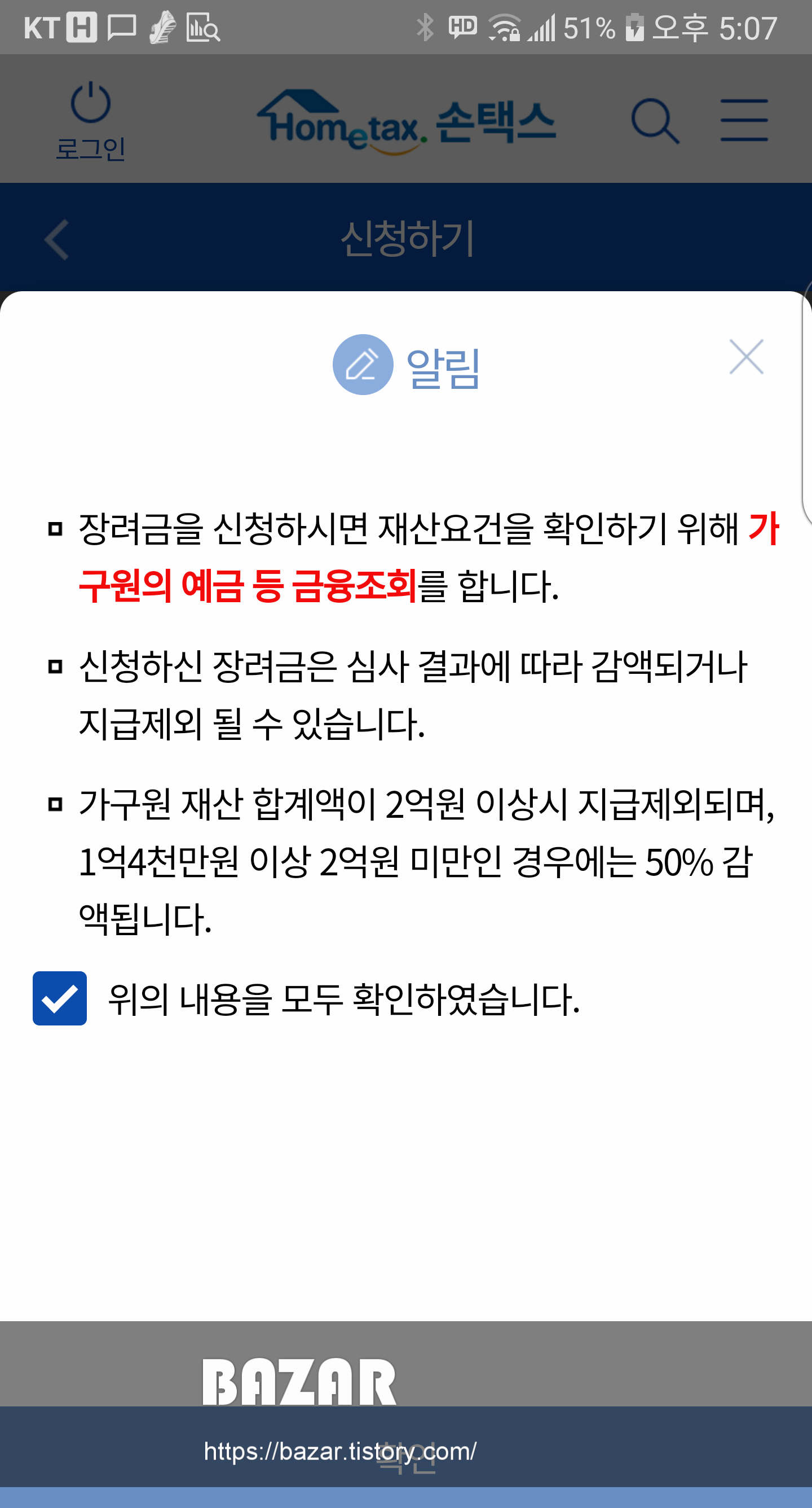 4. 모든 내용을 확인했다면 [확인]을 눌러 주시면 됩니다. 심사 결과에 따라 감액된다는 것을 다시 안내해 주고 있는데요. 가령 자녀로 세액 공제를 받았다면 장려금이 줄어듭니다. 그래서 연말정산이 공제를 받는 것이 좋은지 아닌지를 따져보고 하셔야 합니다. 뭐 공제받는 것이 유리하겠지만 자녀 공제를 받지 않아도 된다면 자녀 공제를 빼면 되겠죠.