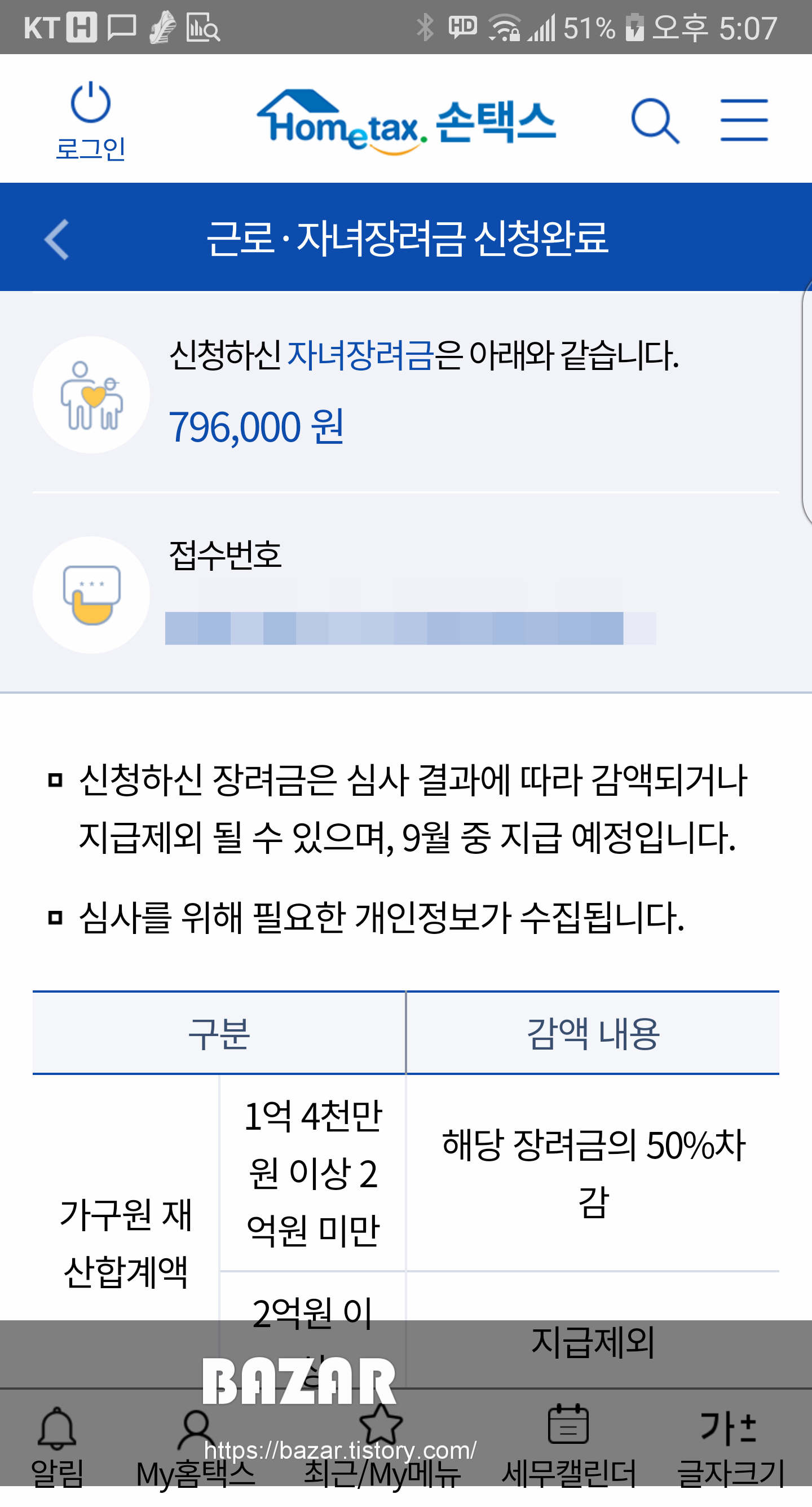 3. 자녀장려금 수령 금액을 확인하시면 됩니다. 저의 경우에는 796,000원을 받을 수 있습니다. 하지만 실제로 그렇게 받게 될지 아니면 변동이 있을지는 나중에 알 수 있습니다. 이전에 최종 수령금액이 달라서 문의해 보니 다 그럴만한 이유가 있더군요. ㅎㅎㅎ