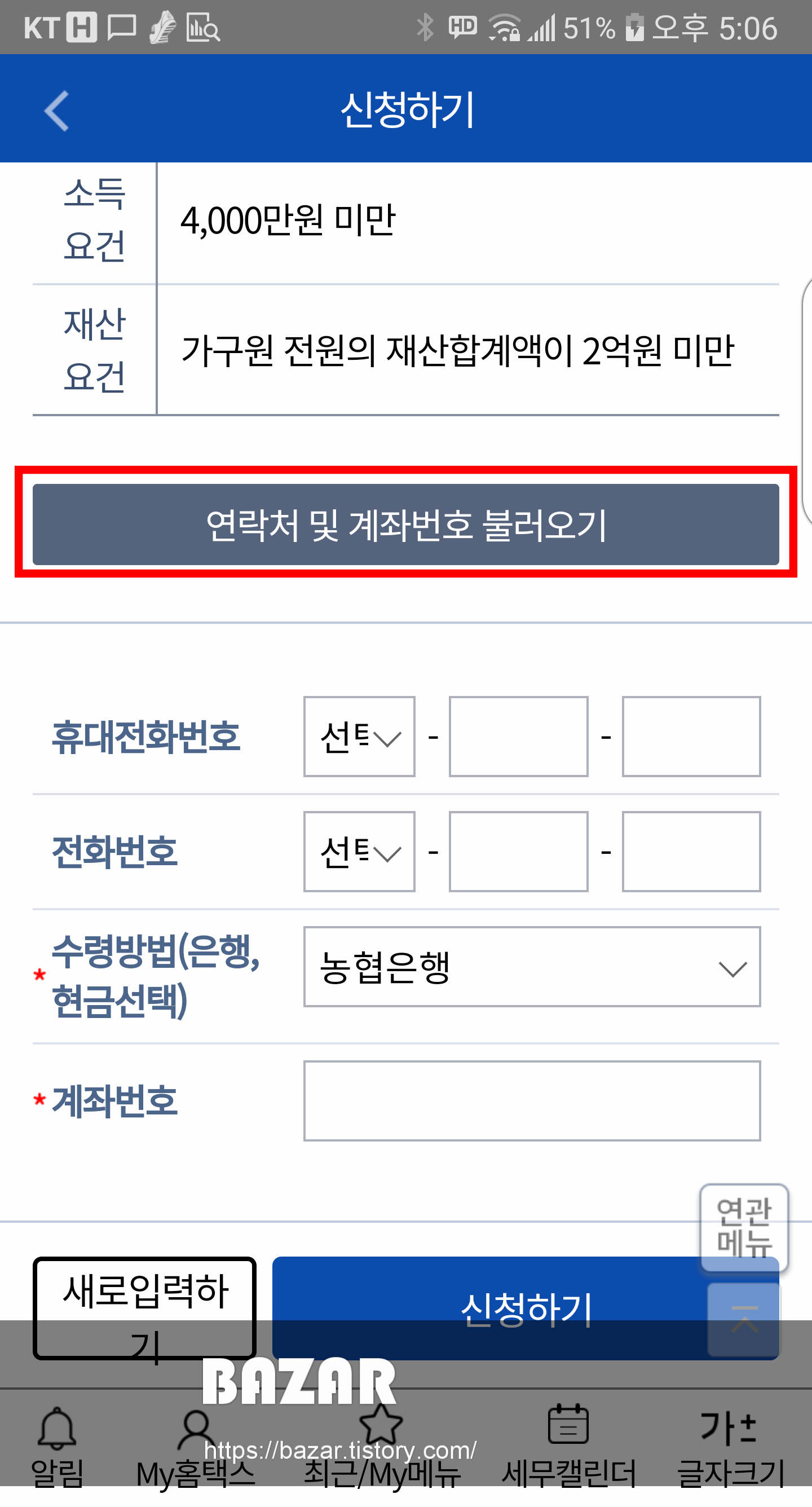 2. 입금받을 계좌번호를 입력하시면 되는데 이전에 입력한 계좌로 받고 싶으시면 아래와 같이 [연락처 및 계좌번호 불러오기]를 클릭하시면 되고, 새로운 계좌로 받고 싶으시면 아래 빈칸을 채워 가시면 됩니다.