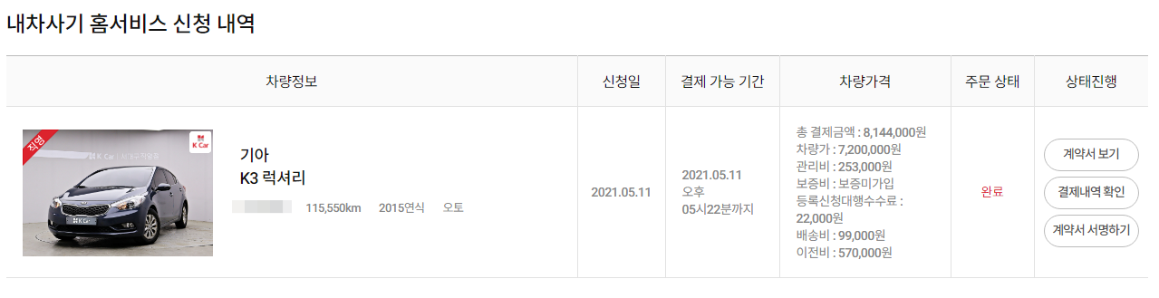 K Car 사이트를 통해서 절차에 따라서 동의하고 공인인증으로 계약을 하니 간단하게 해결 되었습니다. 현찰 혹은 대출을 받고 구매가 가능하며 이전까지도 다 진행해 주니 마치 이마트에서 물건 사는 느낌이 들었습니다. 돈을 다 보내고 이제는 자동차 보험증명서를 팩스로 보내주면 자동차를 보내주는 정말 편한 서비스 였습니다. 원하는 장소에 원하는 시간대에 말입니다.