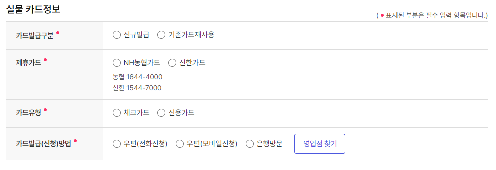 발급신청서에서 원하는 카드 발급 정보를 선택하시면 됩니다. 카드는 농협과 신한카드 중에 선택이 가능합니다.