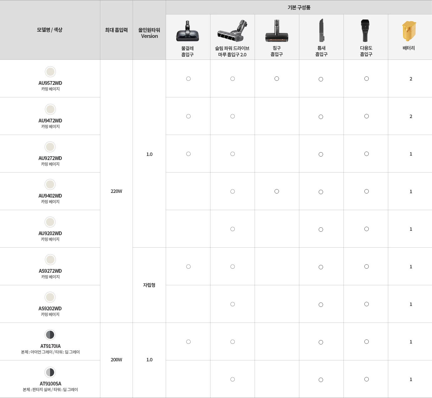 AX모델이라 올인원타워 3.0이며, 흡입력 비교 영상을 보니 크게 차이가 없다고 해서 250W 제품을 선택했습니다. 구성품은 침구 청소 흡입구는 유선으로 하고 있어서 침구 흡입구는 없는 98 모델을 선택했습니다. 96과 92를 선택할 수도 있지만 배터리가 1개라서 제외했습니다. 왜냐하면 스팀청소를 하려고 하면 배터리가 하나 더 필요하기 때문입니다.